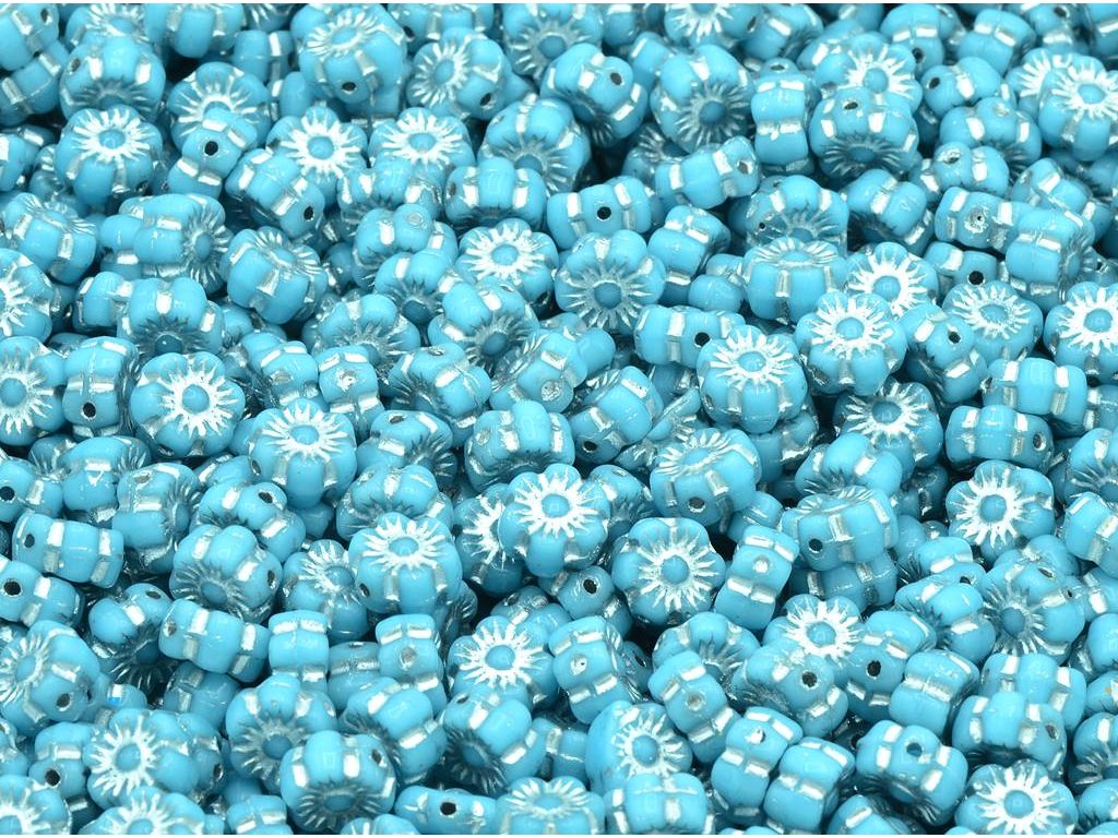 Kvalitní české skleněné korálky ve tvaru kytičky 6 mm, obsah balení 60 ks nebo níže uvedené. Barva tyrkys se stříbrným zátěrem 54201.