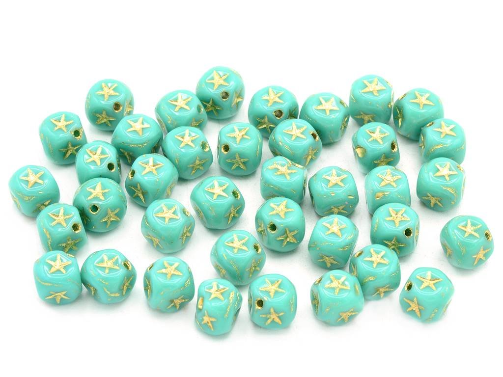 Czech glass beads in the shape of a cube with star relief, size 7 mm, package contents 30 pcs or as described below, turquoise colour with 54202 finish.
