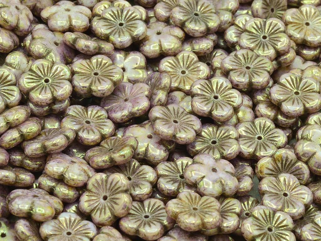 Czech glass beads in the shape of a flower, size 14 mm, chalk white colour with 15695 finish, hole in the middle, package contents 10 pcs or as described below.
